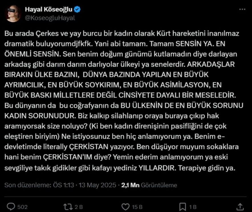 'Bu arada Çerkes ve Yay burcu bir kadın olarak Kürt hareketini inanılmaz dramatik buluyorum. Yani abi tamam, en önemli sensin.'