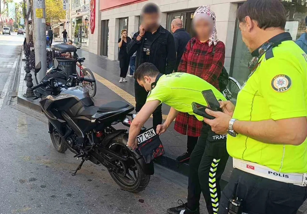 Manavgat İlçe Emniyet Müdürlüğü Trafik Denetleme Büro Amirliği ekipleri, Antalya Caddesi üzerinde devriye görevi sırasında plakasının üzeri bandanayla kapatılmış bir motosiklet fark etti. Ekipler, plakanın okunamayacak şekilde gizlenmesi üzerine motosikleti durdurdu.