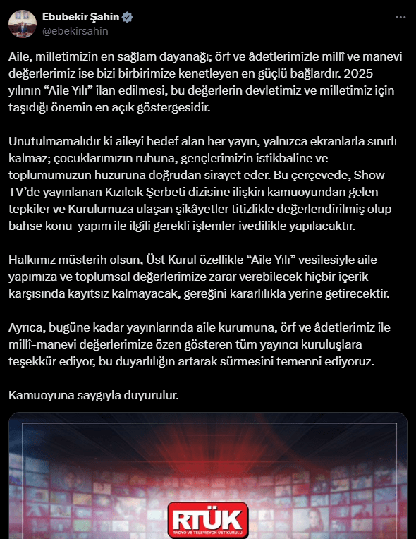 Radyo ve Televizyon Üst Kurulu (RTÜK) Başkanı Ebubekir Şahin, Show TV’de yayınlanan Kızılcık Şerbeti dizisiyle ilgili kamuoyundan gelen tepkiler ve Kurul’a ulaşan şikayetlerin titizlikle değerlendirildiğini açıkladı. Şahin, yapılan incelemeler sonrası gerekli işlemlerin ivedilikle başlatılacağını duyurdu.