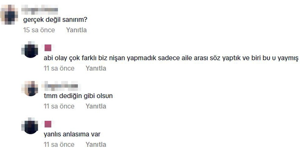 Bazı paylaşımların altına yorum yapan damat adayı, 'Abi olay çok farklı. Biz nişan yapmadık. Sadece aile arası söz yaptık ve biri bunu yaymış. Yanlış anlaşılma var' dedi.