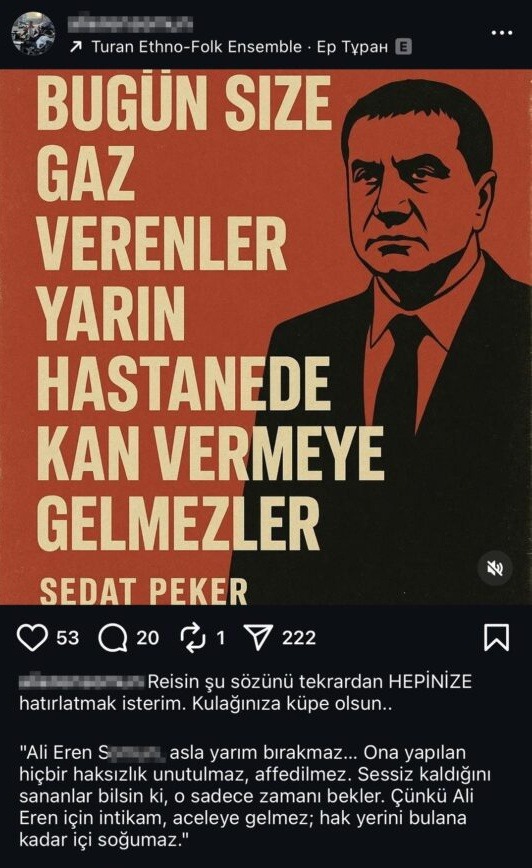 > 'Kulağınıza küpe olsun. Ali Eren S. asla yarım bırakmaz. Ona yapılan hiçbir haksızlık unutulmaz, affedilmez. Sessiz kaldığını sananlar bilsin ki o sadece zamanı bekler. Çünkü Ali Eren için intikam aceleye gelmez. Hak yerini bulana kadar içi soğumaz. SS alın.'