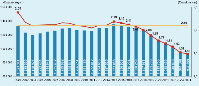 Türkiye, son yıllarda nüfus dinamiklerinde alarm veren bir değişim yaşıyor. Türkiye İstatistik Kurumu’nun (TÜİK) verilerine göre, 2001 yılında 2,38 olan toplam doğurganlık hızı, 2023 itibarıyla 1,51’e 2024 te ise 1.48'e kadar geriledi. Bu oran, nüfusun kendini yenileyebilmesi için gereken 2,1 düzeyinin çok altında. 2016'dan bu yana düşüş eğilimi hızla sürüyor ve bu durum Türkiye’yi “yaşlanan toplum” sınıfına doğru itiyor.